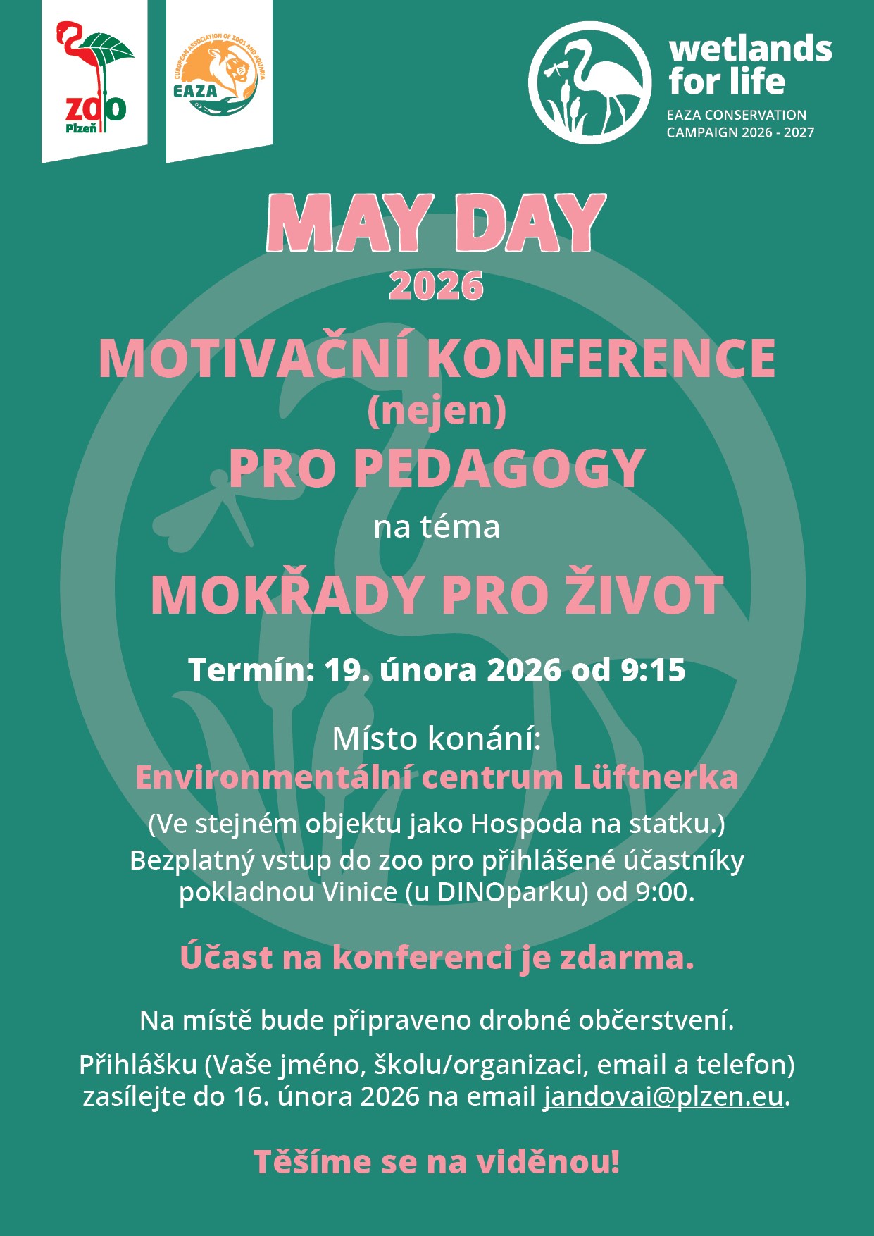 Srdečně zveme pedagogy a zástupce organizací na motivační konferenci k akci May Day, která se uskuteční ve čtvrtek 19. února 2026 od 9:15 v prostorách Environmentálního centra Lüftnerka v Zoologické a botanické zahradě města Plzně.