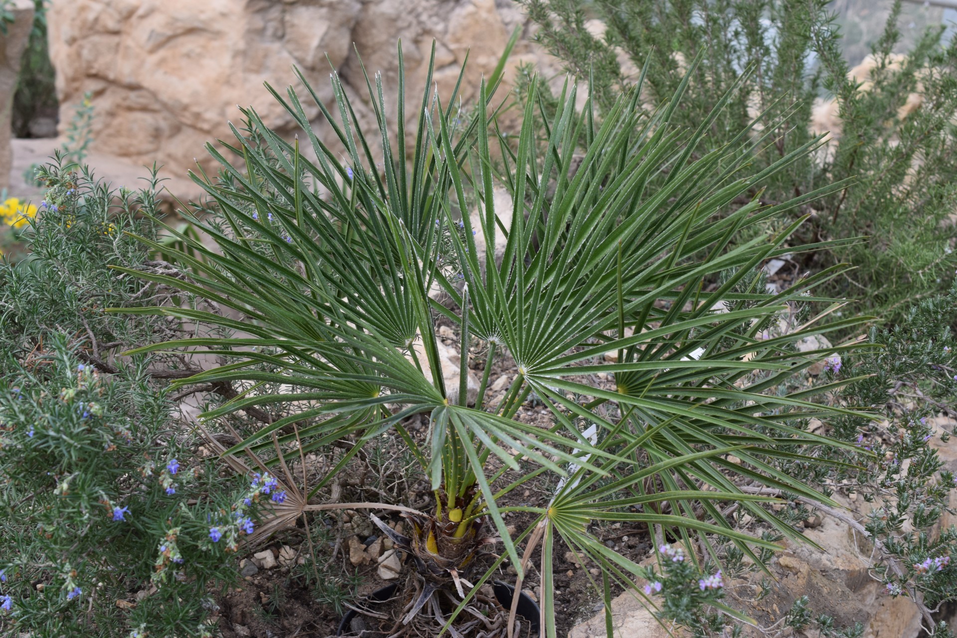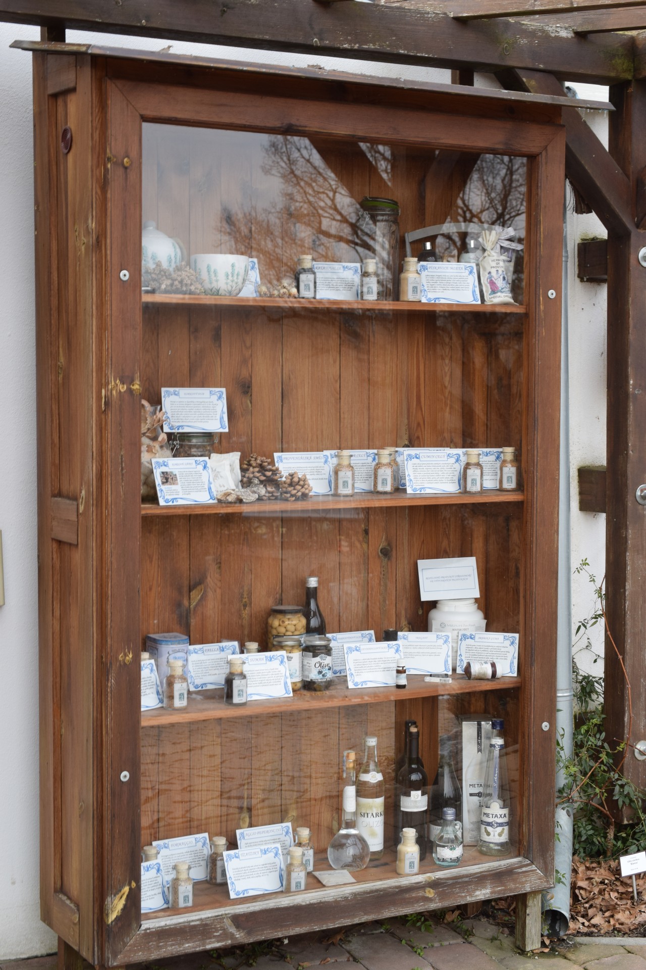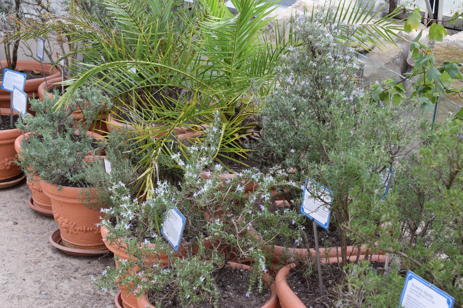 Během roku zde pokaždé něco kvete, jsou to především rozmarýny (Salvia rosmarinus, známější pod dřívějším jménem Rosmarinus officinalis) s různými fialovými odstíny květů, koncem zimy krásné gigantické bledule letní (Leucojum aestivum „Gravetye Giant“) a nápadná Scilla peruviana se svým modrým květenstvím. Později počátkem jara se k nim přidávají například citrusy, venku v nejbližším okolí krokusy, narcisky a koncem jara a celé léto rozkvete políčko levandulí, objeví se ukázky různých odrůd aromatické máty a venku se zazelená celý záhon nejrůznějších středozemních bylinek a zeleniny (o tom, co zde roste, podrobněji až někdy později). Příchozí z obou stran vítá pergola obrostlá vinnou révou.