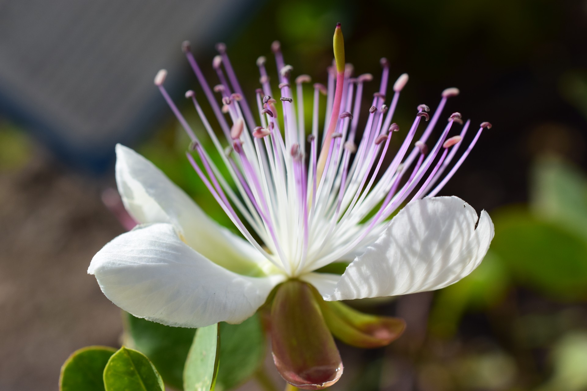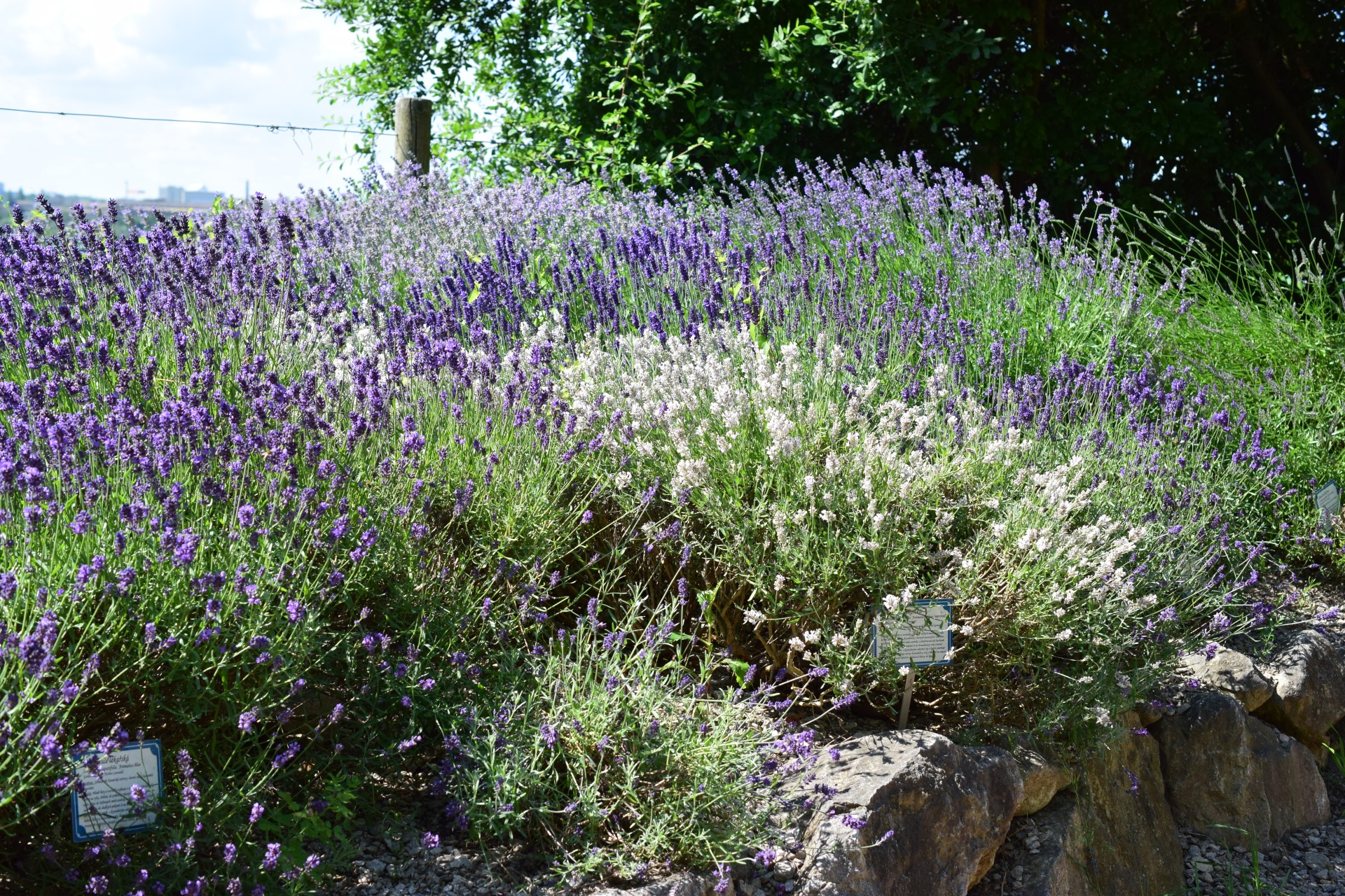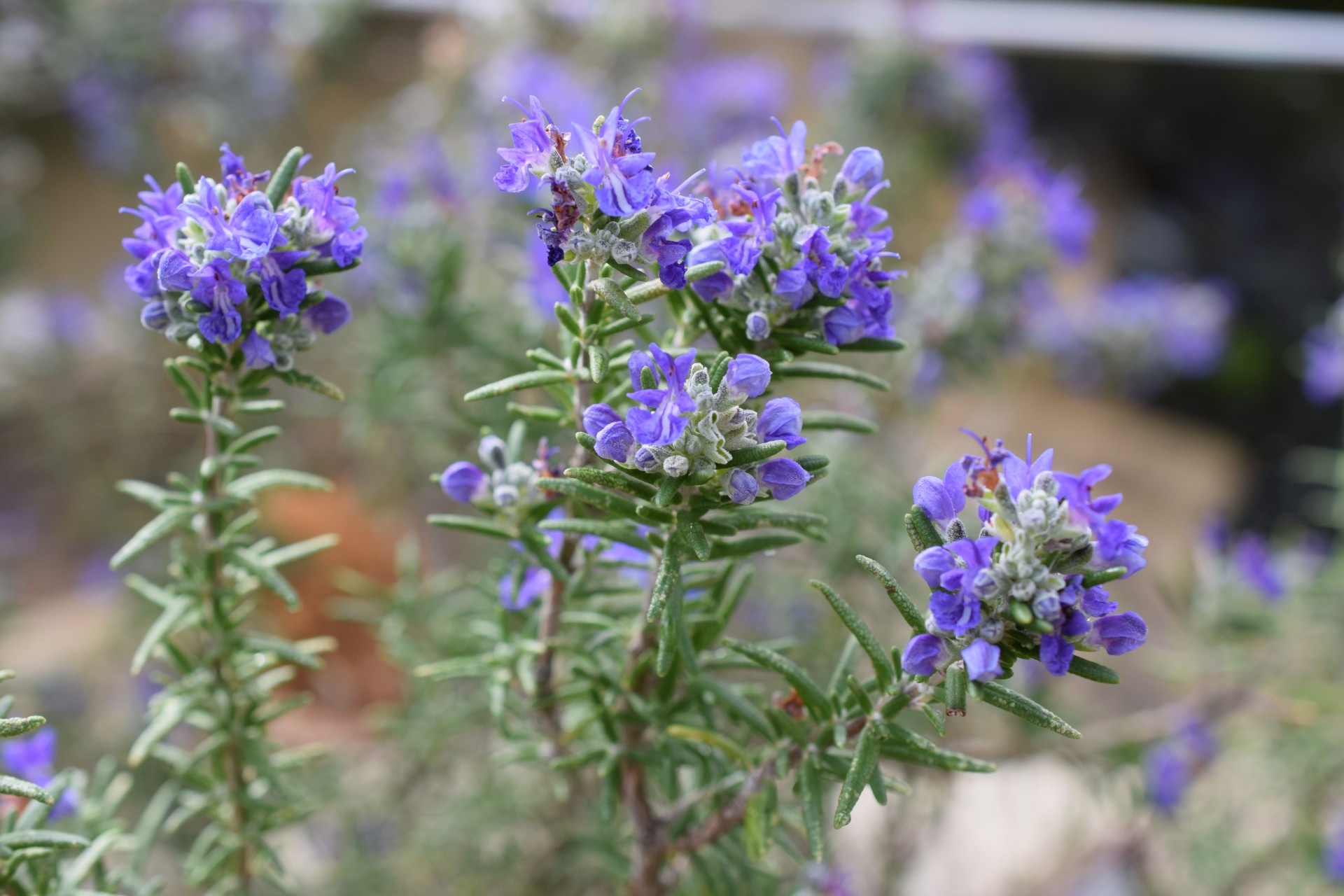 Během roku zde pokaždé něco kvete, jsou to především rozmarýny (Salvia rosmarinus, známější pod dřívějším jménem Rosmarinus officinalis) s různými fialovými odstíny květů, koncem zimy krásné gigantické bledule letní (Leucojum aestivum „Gravetye Giant“) a nápadná Scilla peruviana se svým modrým květenstvím. Později počátkem jara se k nim přidávají například citrusy, venku v nejbližším okolí krokusy, narcisky a koncem jara a celé léto rozkvete políčko levandulí, objeví se ukázky různých odrůd aromatické máty a venku se zazelená celý záhon nejrůznějších středozemních bylinek a zeleniny (o tom, co zde roste, podrobněji až někdy později). Příchozí z obou stran vítá pergola obrostlá vinnou révou.